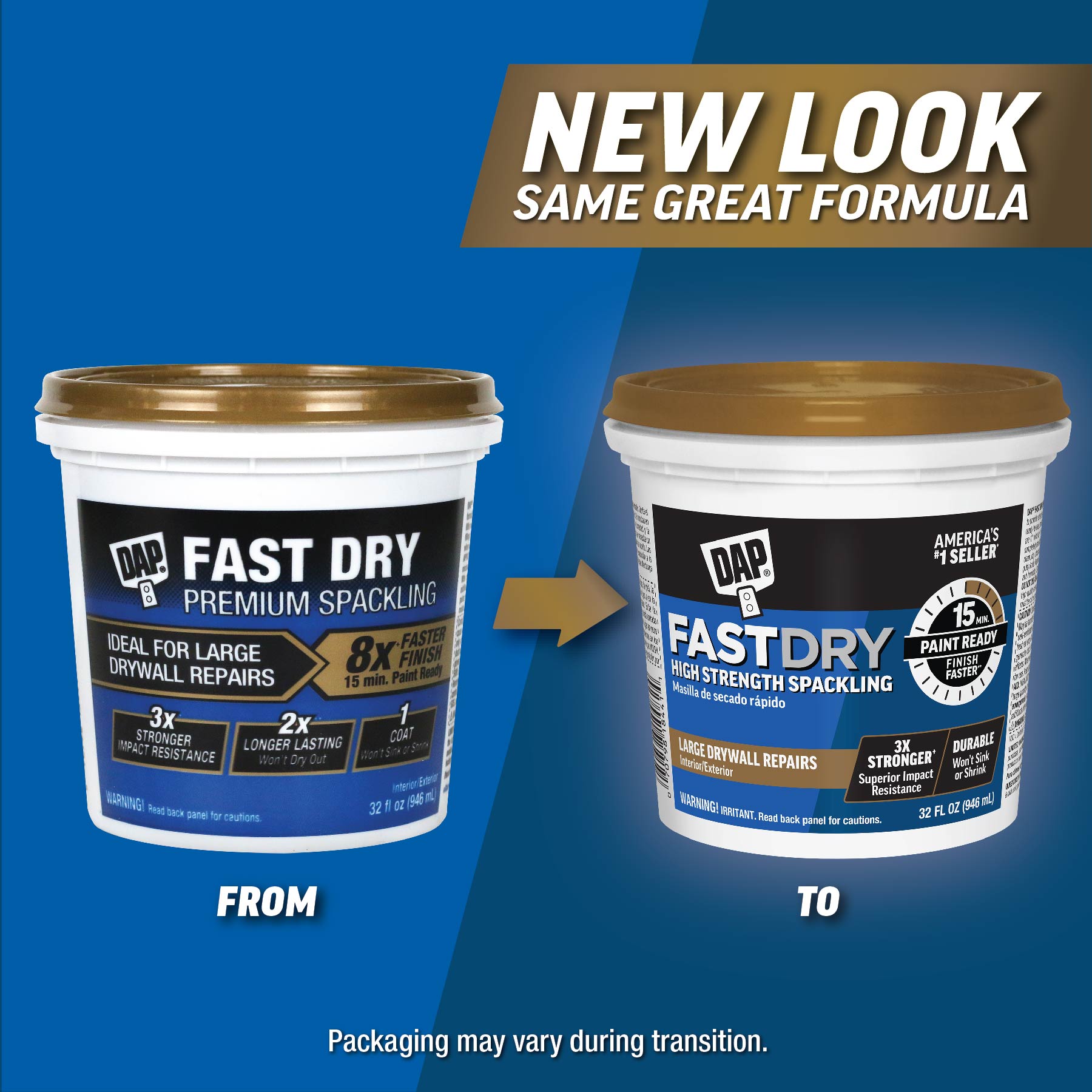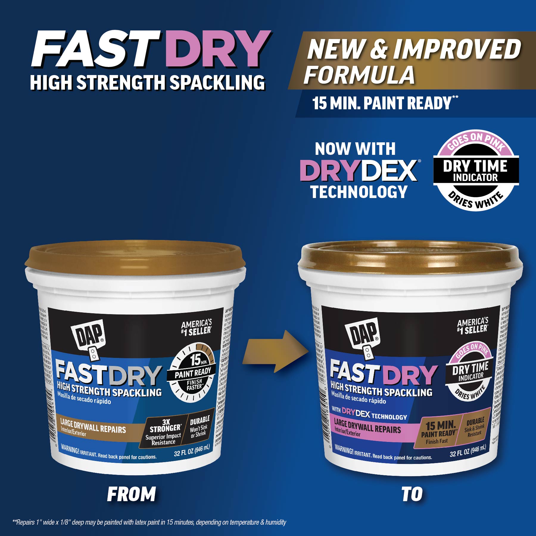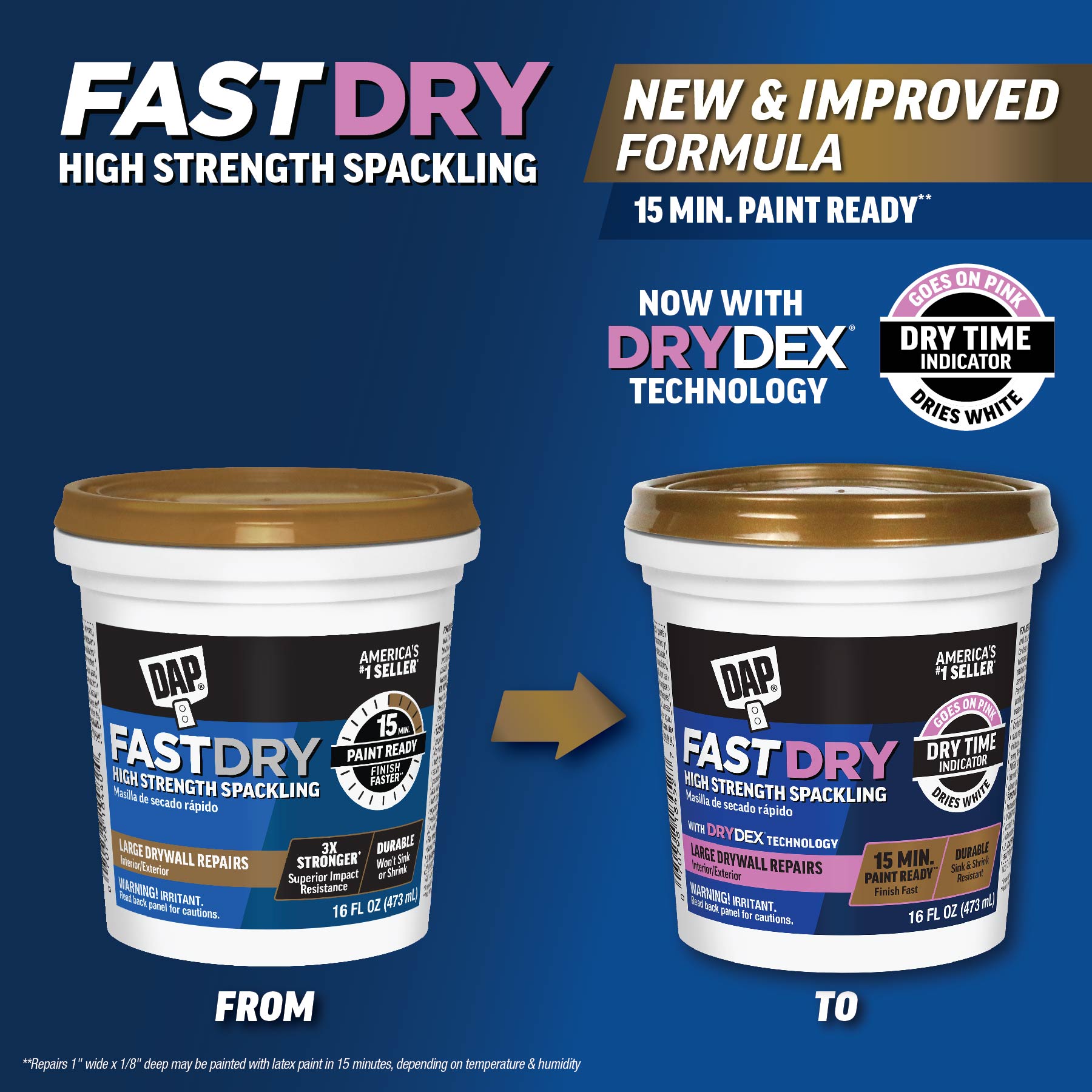 DAP Fast Dry High Strength Spackling is a professional-grade spackling compound uniquely formulated to provide strength and fast drying capabilities allowing some repairs to be painted in as little as 15 minutes. Its ready-to-use, smooth formula spreads easily and won’t sink, shrink or crack, typically filling repairs in one coat. DAP Fast Dry High Strength Spackling is 3X Stronger with superior impact resistance over traditional spackling compounds.