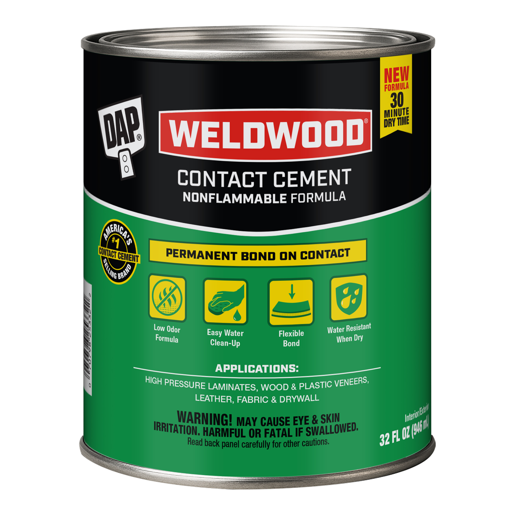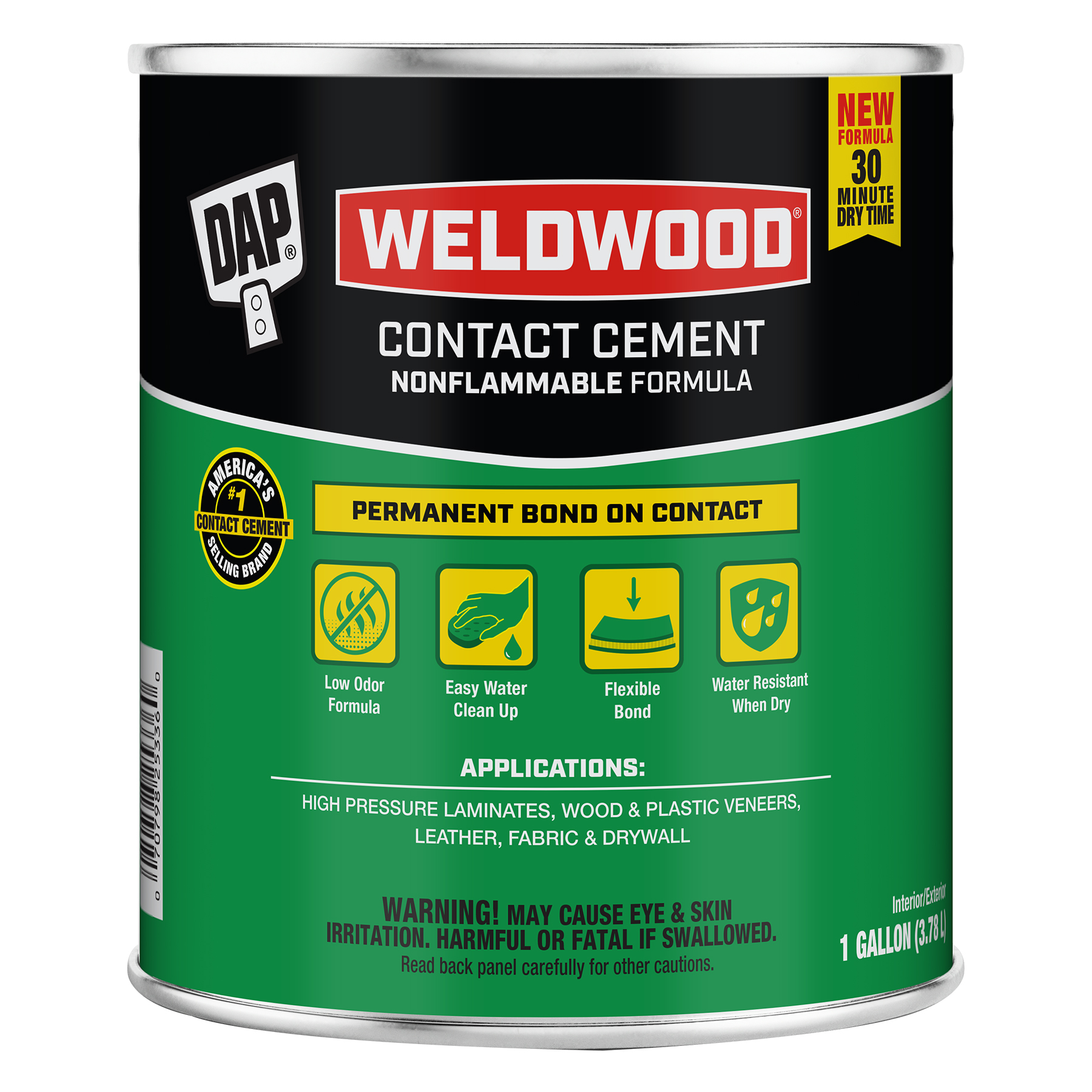 Weldwood Nonflammable Contact Cement is a high solids polychloroprene, waterborne contact adhesive that meets the stringent requirements of the professional user. Complies with all current VOC requirements. Dries in 60-70 minutes, allowing for extra bonding time. Water resistant when dry. Exceeds industry performance requirements. Low odor. Easy water clean-up.